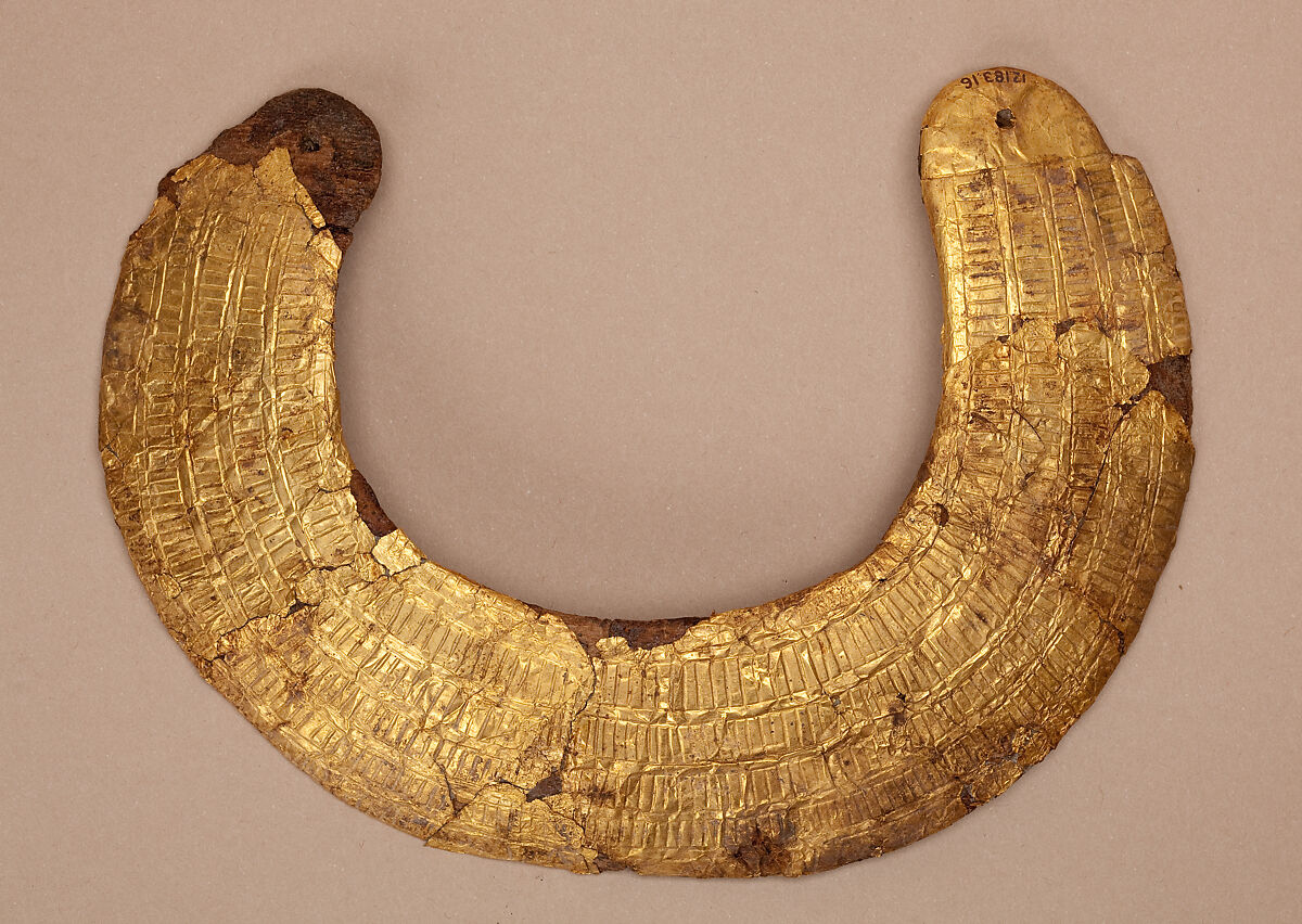 Elaborate broad collars were worn by the Egyptian elite for a variety of festival and religious occasions. These could be floral, made from actual plant material (see 09.184.214), or crafted from individual elements of faience, metal, or semi-precious stone (see 08.200.30). This model collar of wood, gilded and engraved with representations of small beads in rows, echoing an actual example, was found on the chest of Hapiankhtifi's mummy. A string would have been passed through the holes in the two ends and tied around the mummy's neck. Unlike a real collar, this is inflexible, emphasizing its character as a funerary model.
