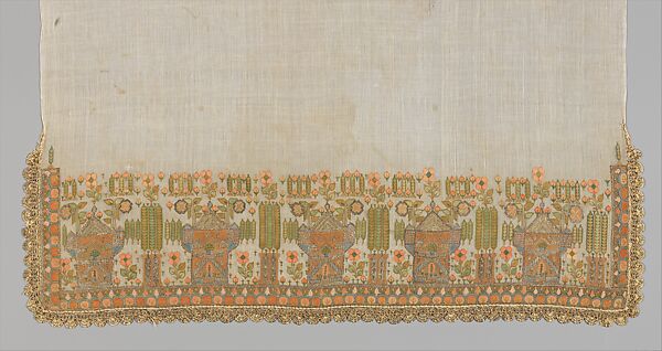 - Medium: Cotton; embroidered in gold and silver metal wrapped thread
