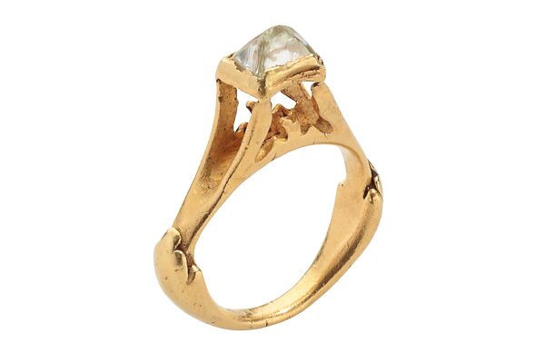 This work of art is currently on loan to the museum.Diamonds were highly prized in the Roman world. They were used in their raw state, as octahedral gems, because techniques for cutting them had not yet been invented. The only source of diamonds was India, and only small numbers reached the Roman world through trade. Here, the special character of the stone is highlighted by the elegant architectural setting, which lifts the gem high above the hoop. The first recorded modern owner of this spectacular ring was Louis de Clercq (1836–1901), a French photographer, archaeologist, and an avid collector of antiquities.