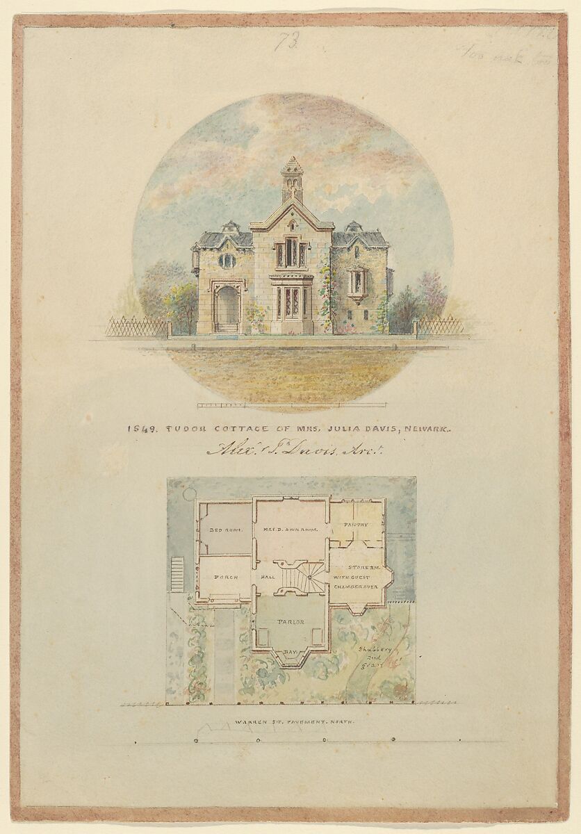 Elevation and plan of Tudor cottage for Davis' mother, Mrs. Julia Davis, at 13 (later 32) Warren Street, Newark, New Jersey. Built 1847–49, with later additions in 1854 and 1859.