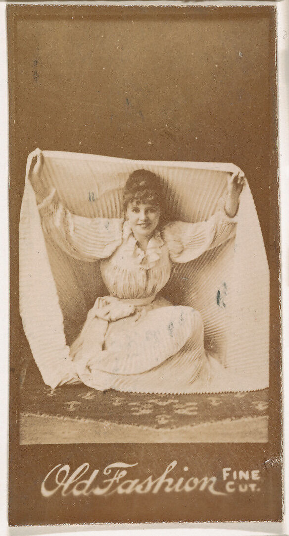 - Title: Actress holding part of skirt above head, from the Actresses series (N664) promoting Old Fashion Fine Cut Tobacco