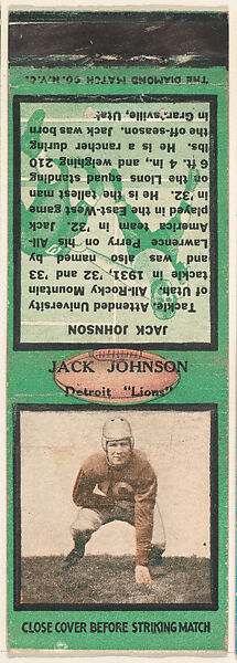- Title: Jack Johnson, Detroit Lions, from the Football Players Match Cover design series (U6) issued by Diamond Match Company