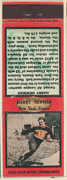 - Title: Harry Newman, New York Giants, from the Football Players Match Cover design series (U6) issued by Diamond Match Company