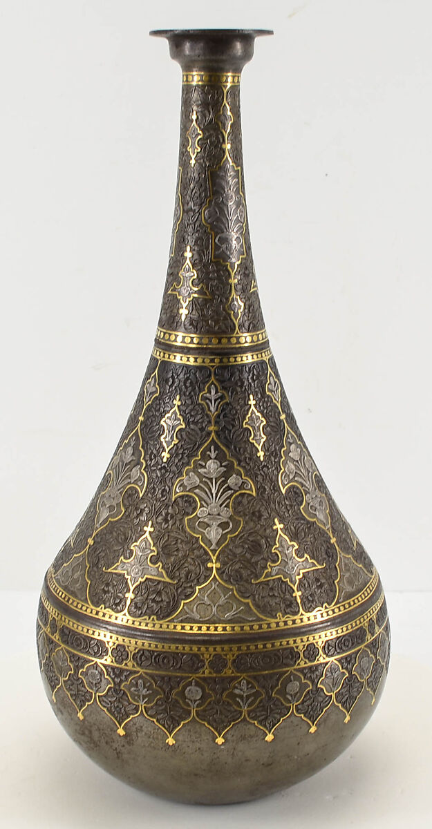 The classic pear-shaped profile of this vase reflects a continuity with an established form found in glazed ceramics and glass that harkens back to the fifteenth and sixteenth centuries. Skilled forging of steel is also a long tradition in Iran where it was used primarily for the production of weapons. In the nineteenth century, however, a demand among members of the court, elite and wealthy merchant class gave way to the introduction of a range of objects in steel such as bowls, ewers, standards (ʿalams), and objects in the shape of fruits such as pears and apples and animals such as cats, peacocks and deer.