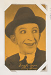 From Movie Stars Exhibit Cards series (W401). Distributed by Exhibit Supply Company of Chicago, Mutoscope or other companies. Postcard-sized thick card. Postcard back. Dispensed in arcade machines. Yellow toned. Includes a greeting on one line followed by the star's name on the next line, both in script.