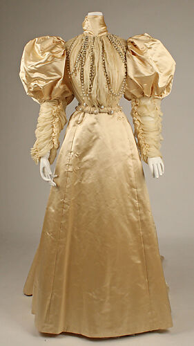 The 1830s silhouette was created by a corseted, raised waistline; here a bell-shaped skirt reveals the lower ankle. By the late 1830s, the gigot sleeve was collapsing at the sleeve cap, but in this case, its detachable pelerine, or capelet, sustained the broad triangulated shoulder line of the period. The similarities between men's and women's fashion extended to footwear: women could wear flat slippers or tiny booties not so different from the boots and walking shoes of men.