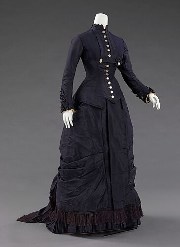 Military-style decoration was recapitulated in civilian clothing, as seen in the front closure, shoulders, and cuffs of the bodice of this dress, although the actual decoration is here deliberately feminized. What might have been bullion fringe becomes delicate mother-of-pearl spangles.
