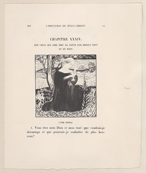 - Title: Page 268, woman holding a goblet in a landscape (recto); prospectus (verso), proofs from 'L'Imitation de Jésus Christ'