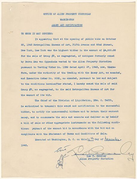 - Title: Office of Alien Property Custodian Washington: Award and Notification