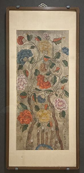 This work of art is currently on loan to the museum.With its lush petals, the peony is admired for its beauty and as a symbol of material prosperity and good fortune. In the nineteenth and twentieth centuries, peony paintings were popular in various formats, from folding screens to single panels. The artist has taken a graphic and uninhibited approach to this subject, using loose lines and dark pigments. As a visualization of abundance, the blossoms, leaves, and stems of the peonies fill the entire painting surface. At the bottom is a blue rock, which is frequently paired with peonies. On the lower left, a child used the painting as a place to practice their letters.