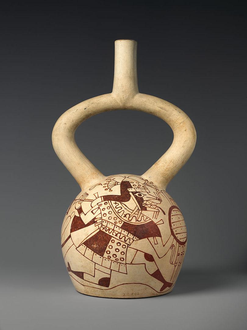 Stirrup-spout bottle with warrior. Moche artist(s); North Coast, Peru, A.D. 500–800. Ceramic and slip, H. 10 1/4 × W. 9 5/8 × D. 6 3/4 in. (26 × 24.4 × 17.1 cm). Gift of Nathan Cummings, 1963 (63.226.8). Prov.: Bruno J. Wassermann, Buenos Aires, 1938–54; Nathan Cummings, Chicago, 1954–63