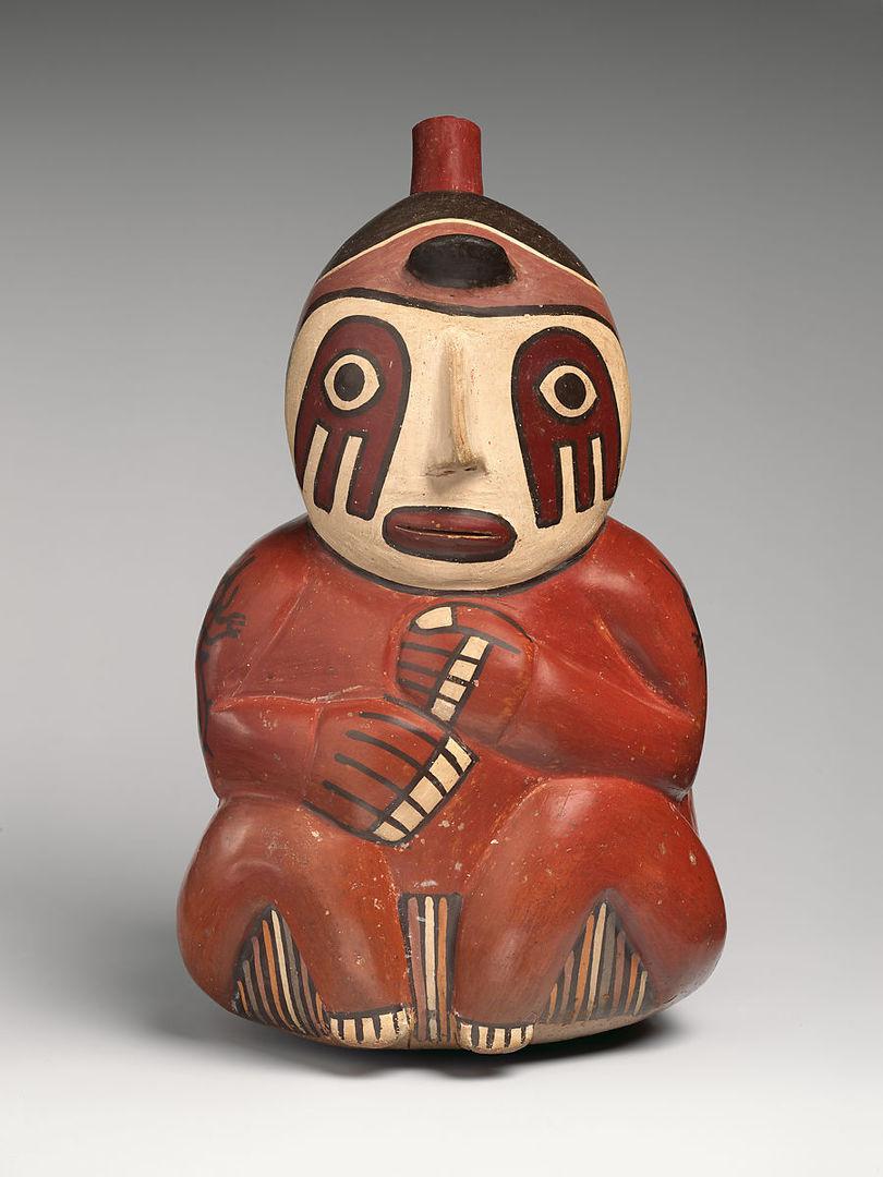 Bottle with seated figure. Nasca artist(s); South Coast, Peru, A.D. 1–300. Ceramic and slip, H. 9 1/8 × W. 5 1/4 × D. 5 1/4 in. (23.2 × 13.3 × 13.3 cm). The Michael C. Rockefeller Memorial Collection, Gift of Mr. and Mrs. Raymond Wielgus, 1960 (1978.412.53). Prov.: Raymond and Laura Wielgus, Chicago, until 1960; the MPA, New York, 1960–78