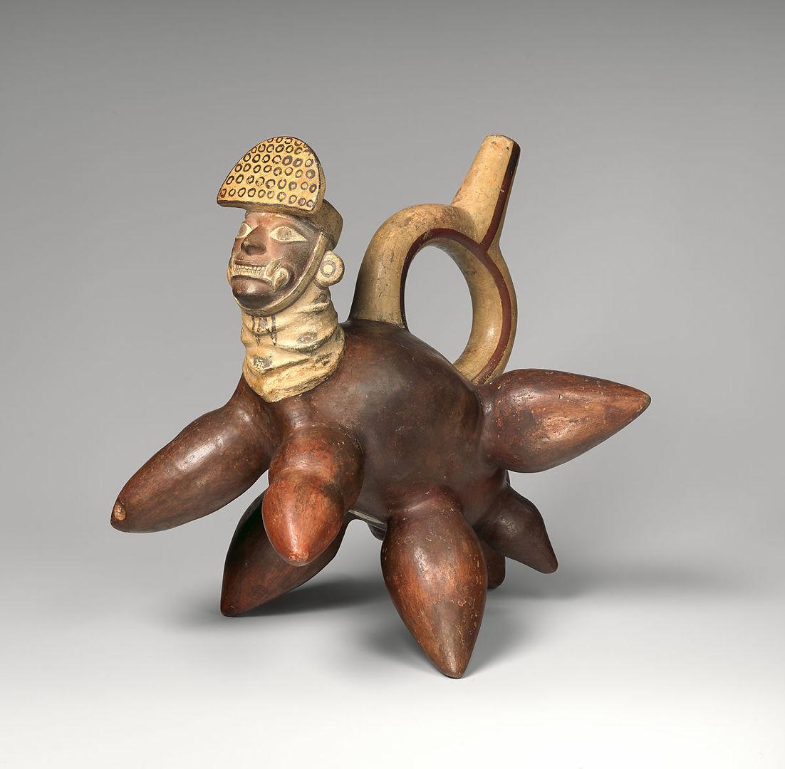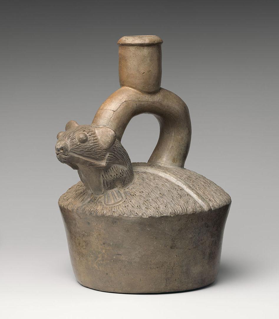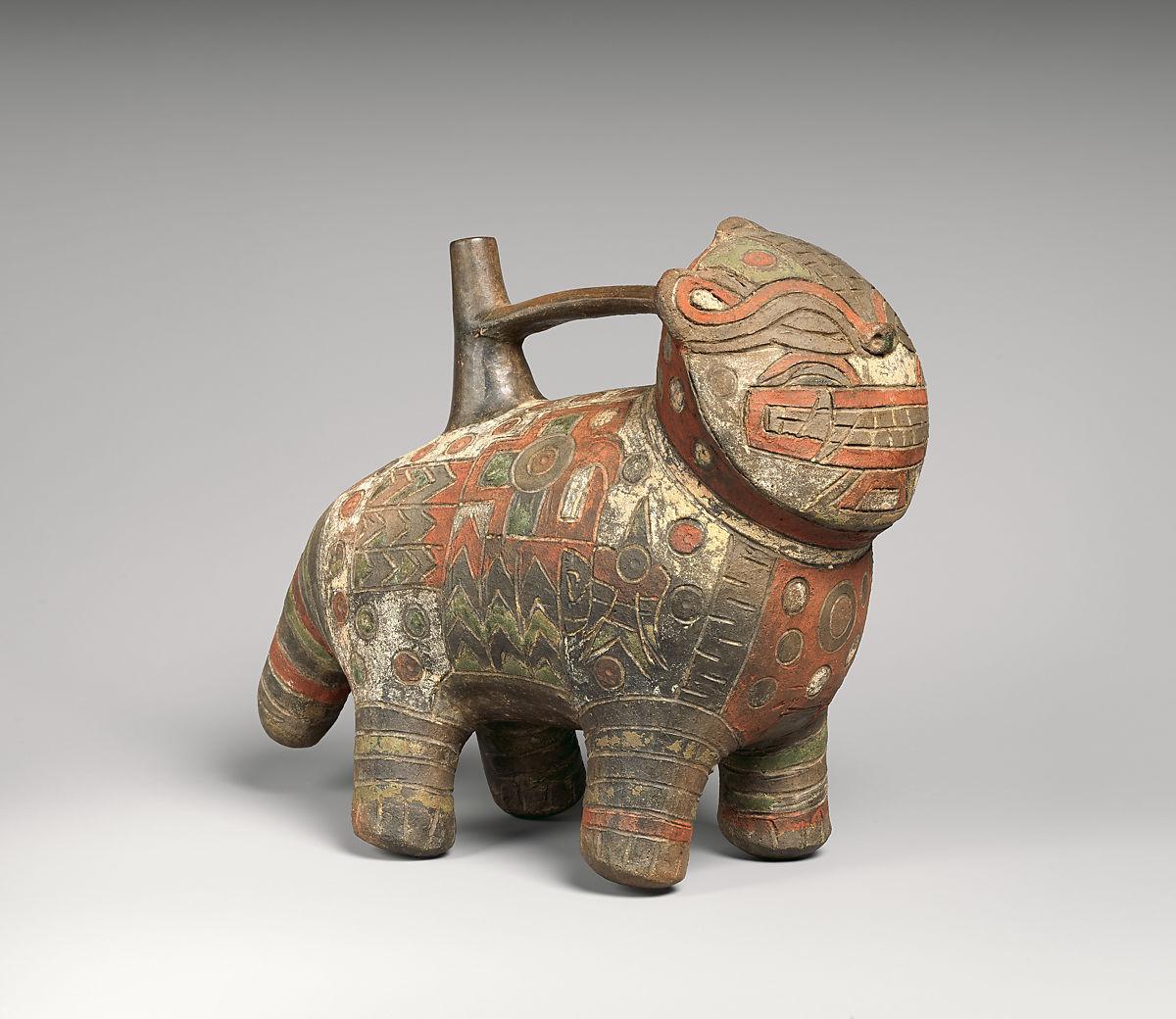 Stirrup-spout bottle with feline, Chimú artist(s), North Coast, Peru, A.D. 1100–1470. Ceramic, H. 11 1/4 × W. 10 1/8 × W. 5 1/8 in. (28.6 × 25.7 × 13 cm). Gift of Mr. and Mrs. Nathan Cummings, 1964 (64.228.17). Prov.: Bruno J. Wassermann, Buenos Aires, 1938–54; Nathan Cummings, Chicago, 1954–6