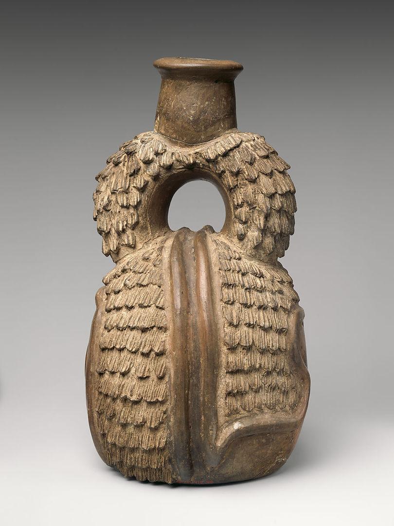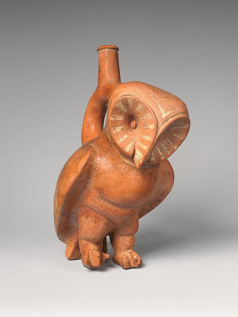 Stirrup-spout bottle with owl. Moche artist(s); North Coast, Peru, A.D. 200–500. Ceramic and slip, H. 9 1/2 × W. 4 5/8 × D. 5 3/4 in. (24.1 × 11.7 × 14.6 cm). Gift of Nathan Cummings, 1966 (66.30.5). Prov.: Nathan Cummings, Chicago, until 1966