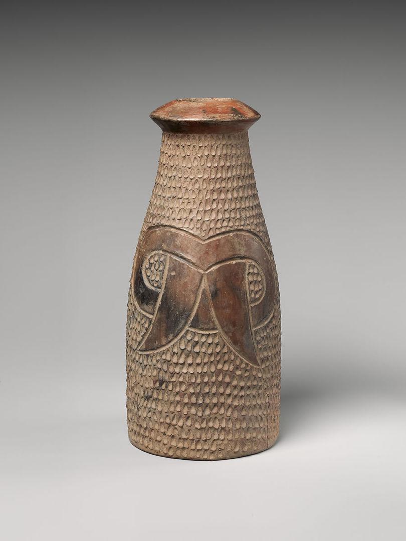 Paccha (ritual vessel). Inca artist(s); Peru, 15th–16th century. Ceramic and slip, H. 8 1/4 × W. 4 × D. 12 1/4 in. (21 × 10.2 × 31.1 cm). Rogers Fund, 1986 (1986.383.1). Prov.: Sotheby’s, New York, 1981; Louis Slavitz, New York, until 1986