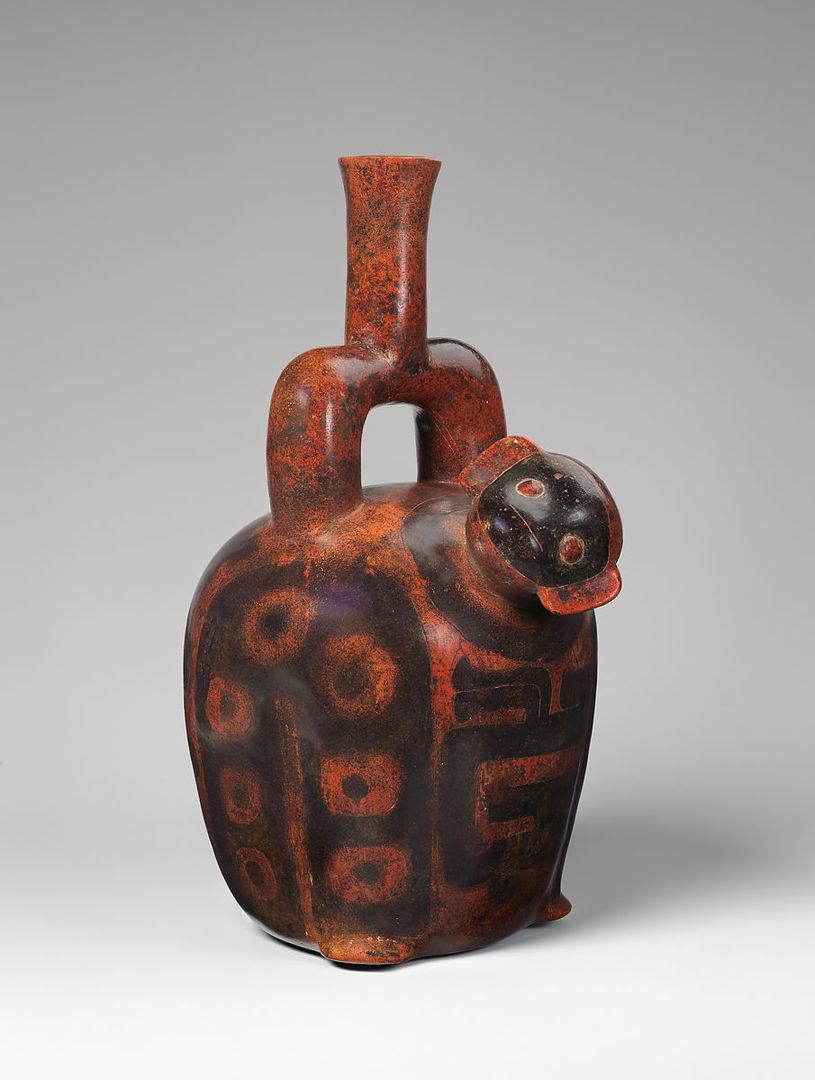 Stirrup-spout bottles were adopted by potters on Peru’s North Coast around 1200 B.C. Named in modern times after the spout’s resemblance to a riding saddle stirrup, these bottles remained the most recognizable vessel type in this region for the next 2,700 years. The peculiar spout provided a useful handle, but its main appeal may have been symbolic. By manipulating the flow of liquids, the spout could represent the circulation of water from rain to lakes, rivers, plants, and people. The water cycle may have been an organizing principle that aided Andean communities in understanding the complexity of the world and their place within it.