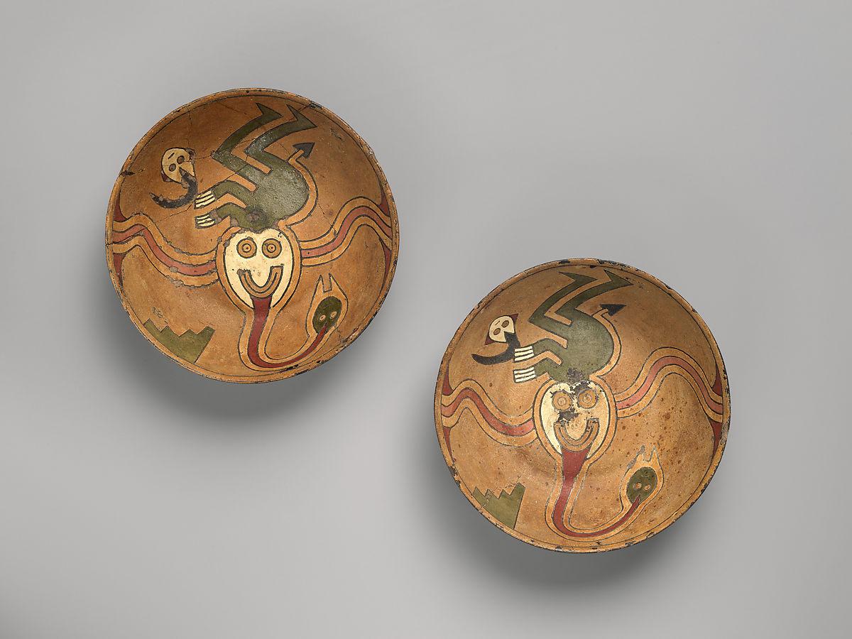 Left: Rattle bowl with flying figure (Oculate Being). Paracas artist(s); Ica Valley, Peru, 350 B.C.–A.D. 60. Ceramic and post-fire paint, H. 2 1/8 × W. 6 7/8 × D. 6 7/8 in. (5.4 × 17.5 × 17.5 cm). Gift of Nathan Cummings, 1976 (1976.287.31). Prov.: Nathan Cummings, Chicago, until 1976