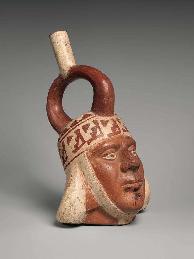 Bottle with portrait head. Moche artist(s); North Coast, Peru, A.D. 500-800. Ceramic and slips, H. 10 3/8 × W. 6 3/8 × D. 7 in. (26.4 × 16.2 × 17.8 cm). Purchase, Gift of Henry G. Marquand, 1882 (82.1.28). Prov.: Hon. Richard Gibbs Collection, Peru, 1875–79; Henry G. Marquand, New York, 1880–82