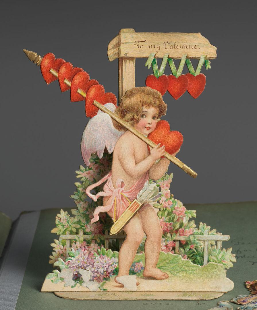 Die-cut, stand up valentines made between 1880 and 1910 offered a modern choice for young lovers. Popular contemporary themes such as ships, automobiles, and even airplanes were imported from Germany, the center of chromolithography, and were added to the traditional selection of cupids and doves.