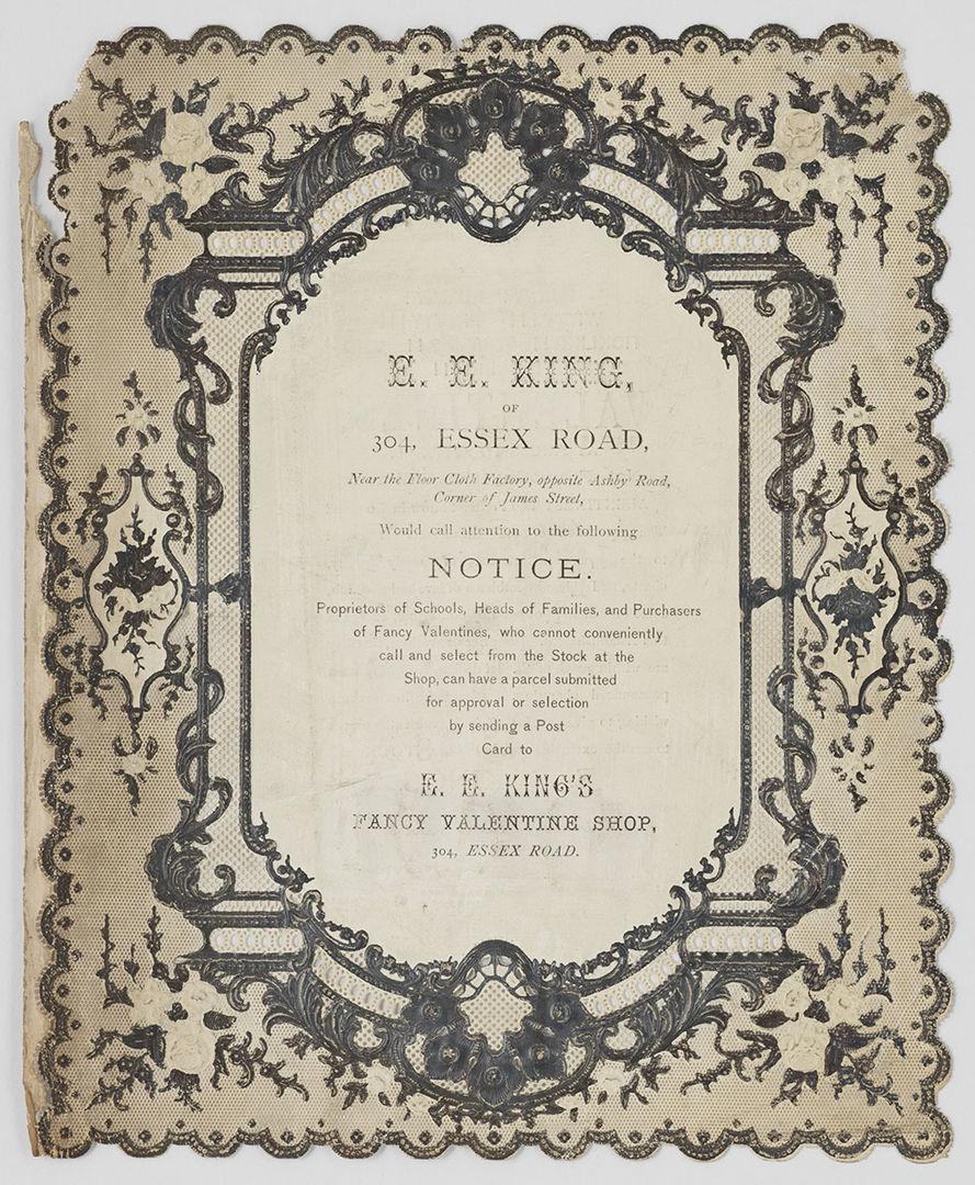 By the mid-nineteenth century, the celebration of St. Valentine’s Day had become an international phenomenon. In London, the number of valentines that were processed by the city’s general post office rose from approximately 60,000 before 1840 to 1.2 million in 1871 after the establishment of the Universal Postal System, which made sending mail easier and less costly. In addition, thanks to technological advancements in printing processes, the naïve, hand-crafted valentines of the early part of the century gave way to mass-produced versions. King took advantage of these improvements to the industry. Along with fellow Englishman Eugene Rimmel (1820–1887) and the American entrepreneur Esther Howland (1828–1904), he was one of the most successful producers of elaborate, trend-setting valentines in history.