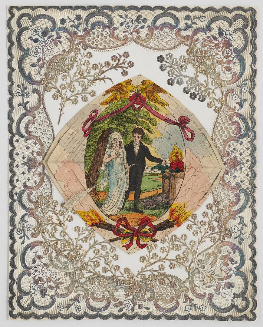 Anonymous, British, 19th century. Cobweb Valentine with Couple at an Altar of Love, ca. 1865. Etching with watercolor mounted on silver embossed lace paper with silver Dresden leaves and silk tassle, sheet: 9 13/16 × 7 7/8 in. (25 × 20 cm). Gift of Mrs. Richard Riddell, 1984 (1984.1164.1829.68)