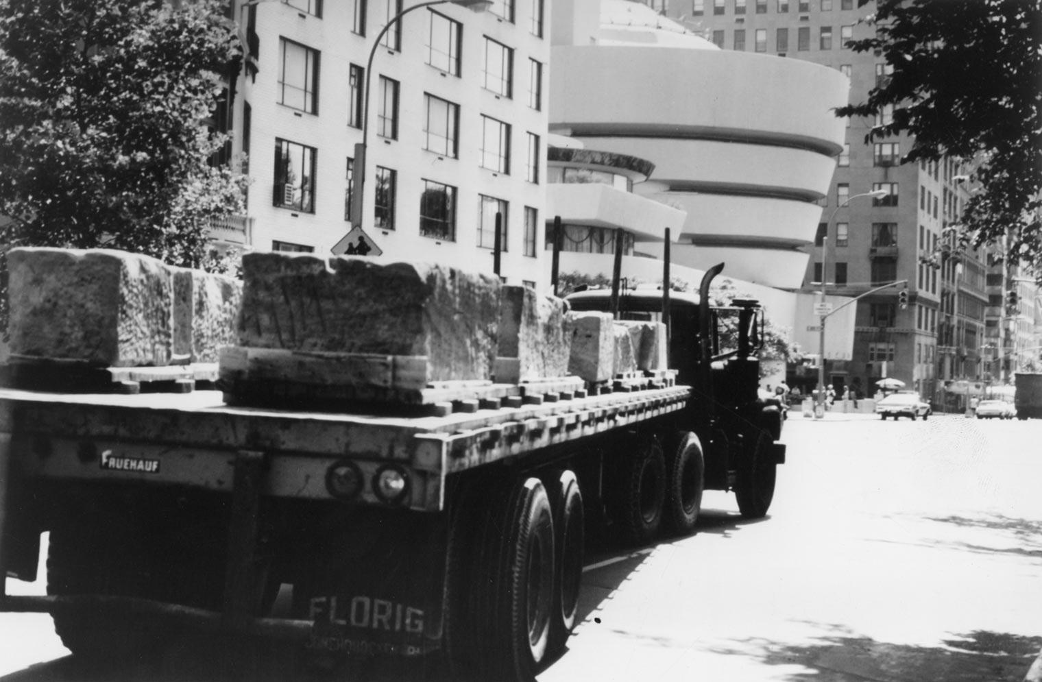 The temple's blocks as they were transported south on Fifth Avenue from the air structure to the newly renovated loading dock