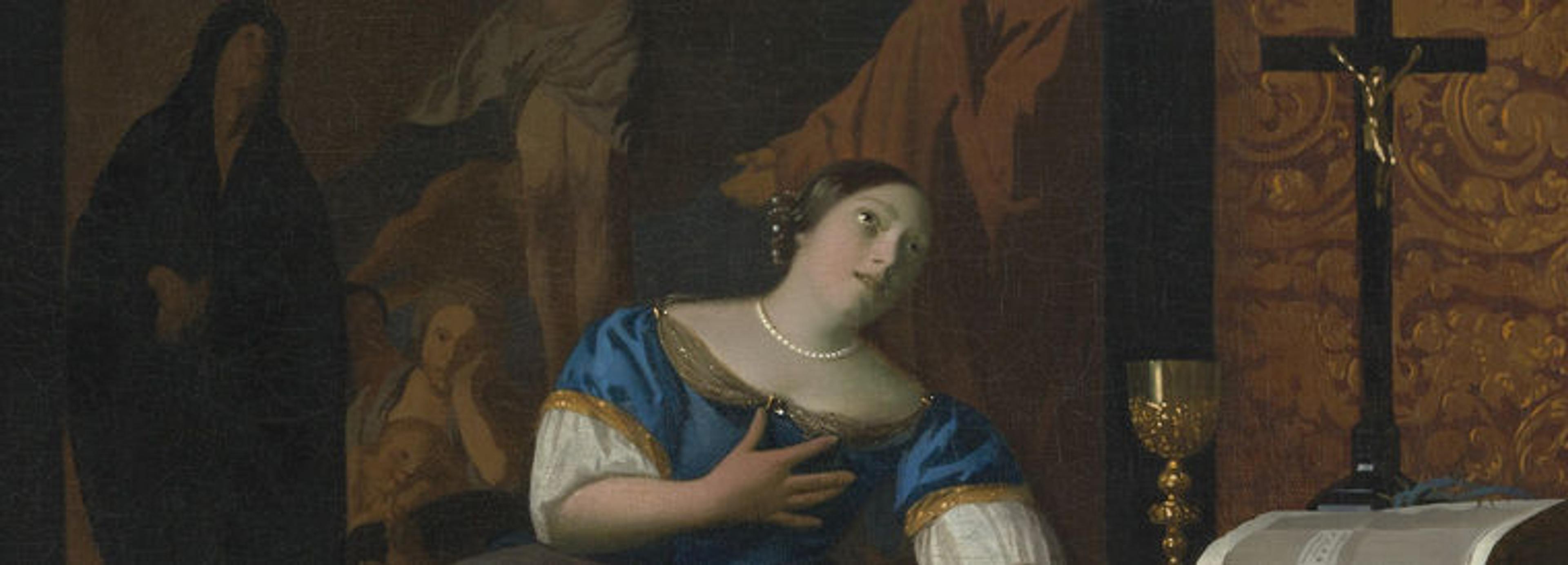 The Dutch Revolt began in 1566 with an outburst of violence that included the wholesale destruction of religious art in churches throughout the Netherlands (events known as the Iconoclasm). In the officially Protestant Dutch Republic that gained independence over the following decades, devotion focused on scripture, ostensibly without the mediation of images, and churches were whitewashed and stripped of paintings, sculpture, and stained glass. Nonetheless, a substantial portion of the population, including prominent citizens and artists such as Vermeer, remained Catholic. The paintings gathered in this section—ranging from views of the reformed interiors of Protestant churches to images of Catholic devotion, intended for the private veneration of the Virgin Mary—reflect the religious diversity of the Dutch Republic.