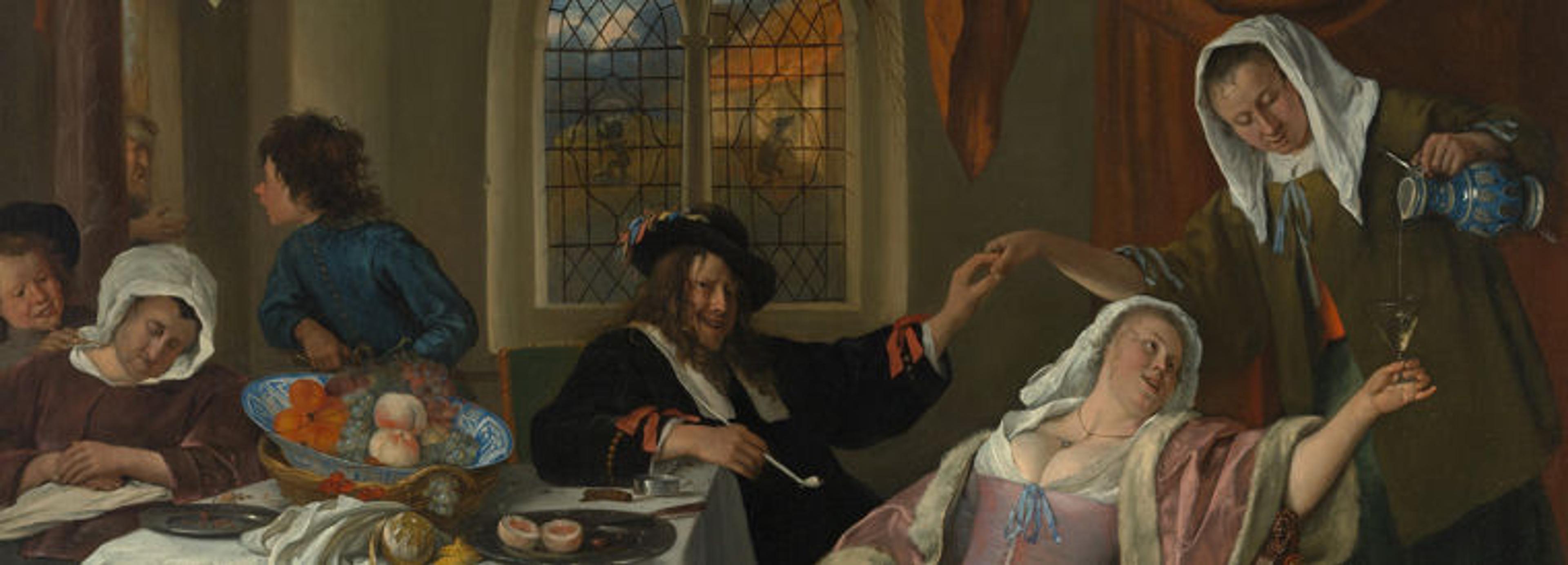 NARRATOR: Sloth, lust, gluttony, sacrilege, gambling, vanity, and poor parenting—all are on full display in Jan Steen’s Dissolute Household.