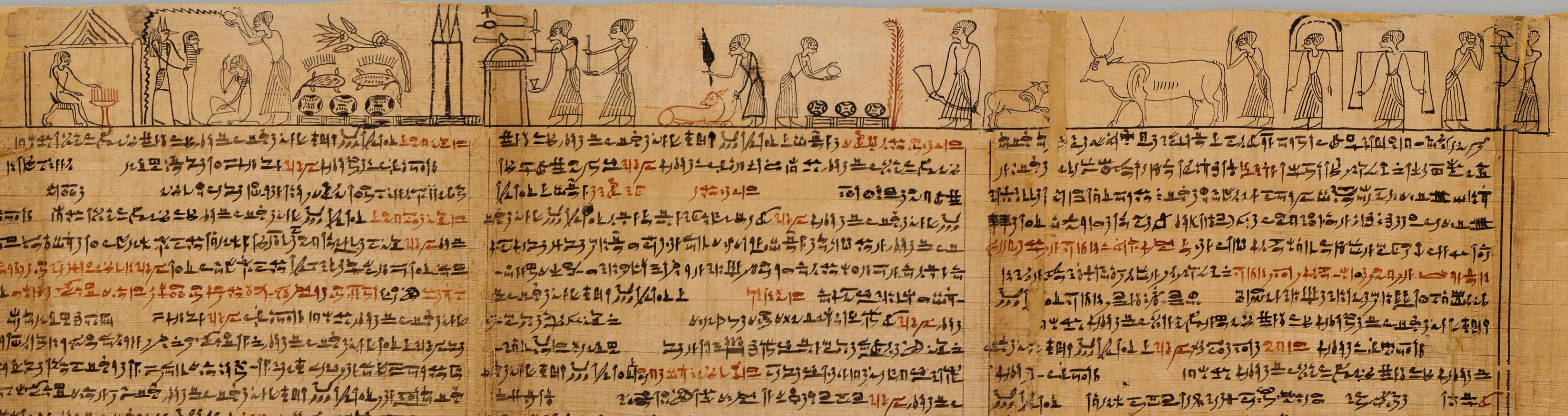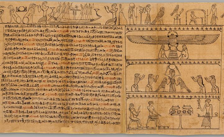 Imhotep's Book of the Dead is inscribed in a cursive script known as hieratic, arranged in horizontal lines of text divided into columns. A narrow band of illustrations runs along the top, with larger scenes that take up the entire height of the document at intervals. Included are more than 250 individual texts and vignettes taken from a corpus of spells, prayers, and incantations known collectively as the Book of Coming Forth by Day, or, as it has been nicknamed by Egyptologists, the Book of the Dead.