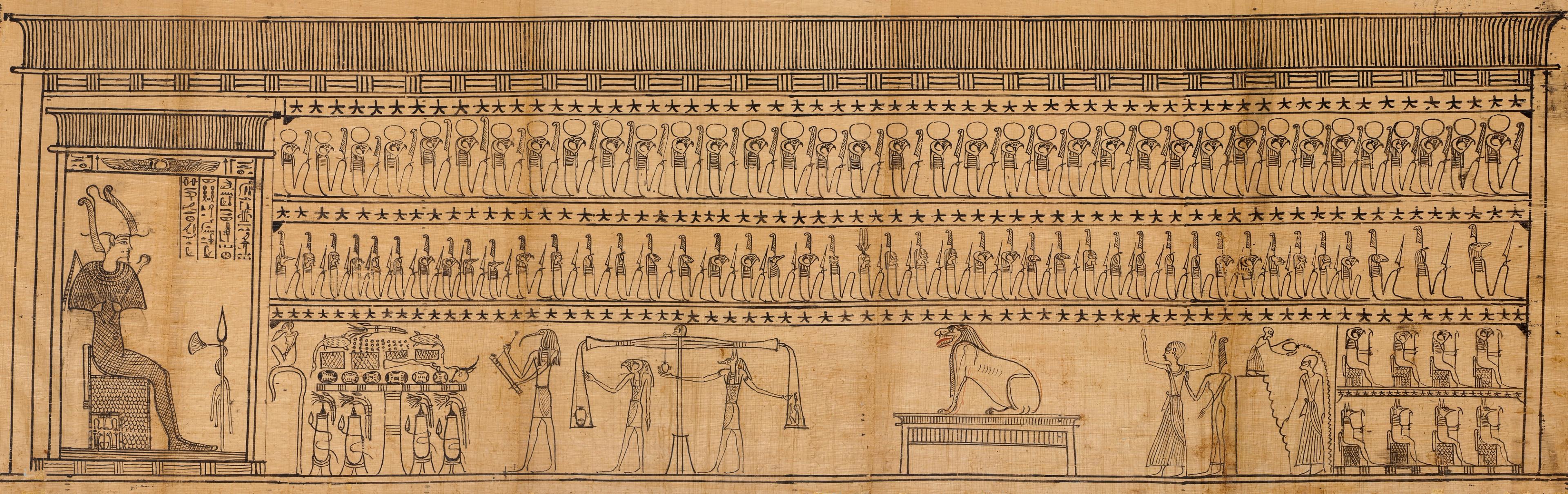 Osiris (far left) presides over the Judgment Scene, which determines whether Imhotep (pictured twice on the right, once having water poured over him and once with his arms raised) will live forever or have his heart eaten by the monster Ammut (the creature with the red tongue on top of the shrine, center right). Book of the Dead of the Priest of Horus, Imhotep (Imuthes). Early Ptolemaic Period, ca. 332–200 B.C. From Egypt; Probably from Middle Egypt, Meir (Mir). Papyrus, ink; Approximate measurements (framed): L. 219 m (71 ft. 10 3/16 in); H. 35 cm (1 ft. 1 3/4 in.). Length previously estimated at 63 ft. (192 m). The Metropolitan Museum of Art, New York, Gift of Edward S. Harkness, 1935 (35.9.20a–w)