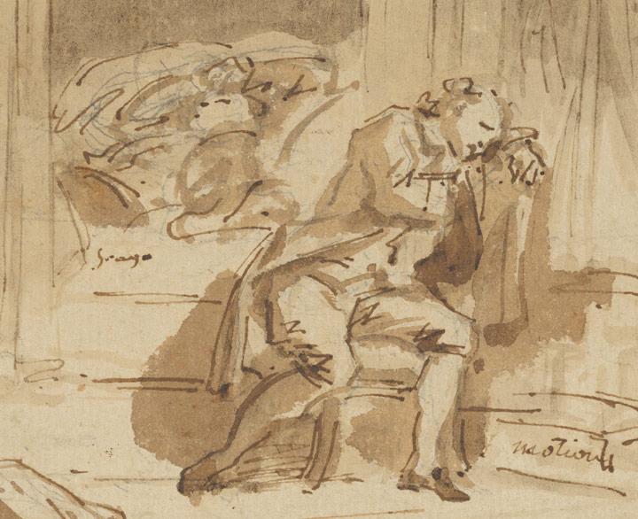 In this humorous sheet, the scene of the four men (and perhaps a servant) aboard a large boat is rendered in the caricature-like style Fragonard often reserved for his most personal subjects. He captures, in his usual quick and incisive penwork, the suffering of a group of travelers overwhelmed with seasickness. Sprawled throughout the sleeping cabin, they seem to writhe and moan. Only the artist's patron, Bergeret de Grancourt, seems immune to nausea; he can be seen through the doorway working industriously at his desk. Fragonard was less fortunate: Identified in his typical shorthand as "frago," he is visible stretched out in the alcove on the right, his eyes closed.