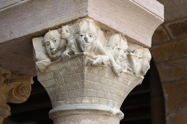 A capital from the cloister of Sainte-Foy de Conques depicting masons at work