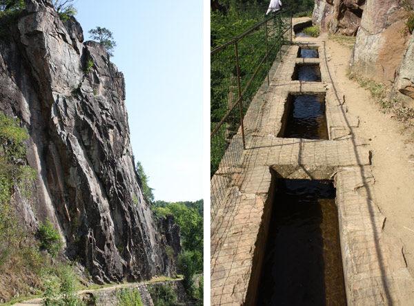 Left: The narrow canal and corresponding footpath run past many dramatic rock formations. Right: The canal at Aubazine