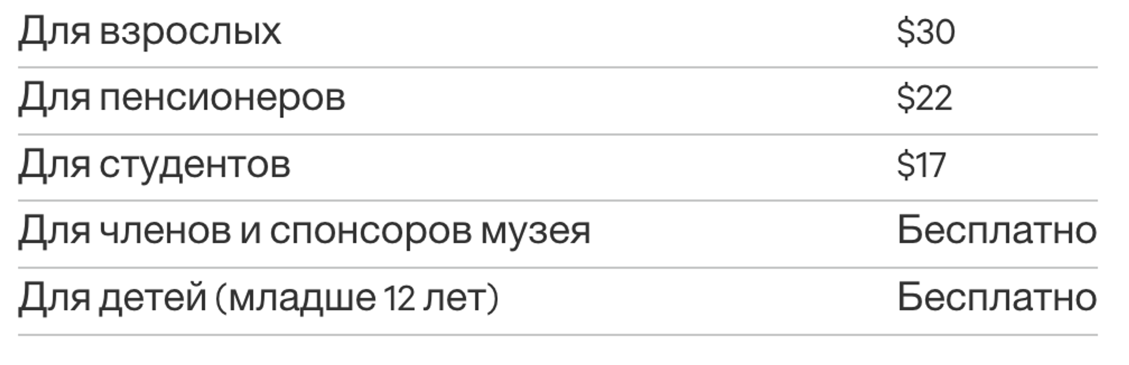 Жителям штата Нью-Йорк, а также студентам из штатов Нью-Йорк, Нью-Джерси и Коннектикут, предлагается вносить за билет любую доступную им сумму.
