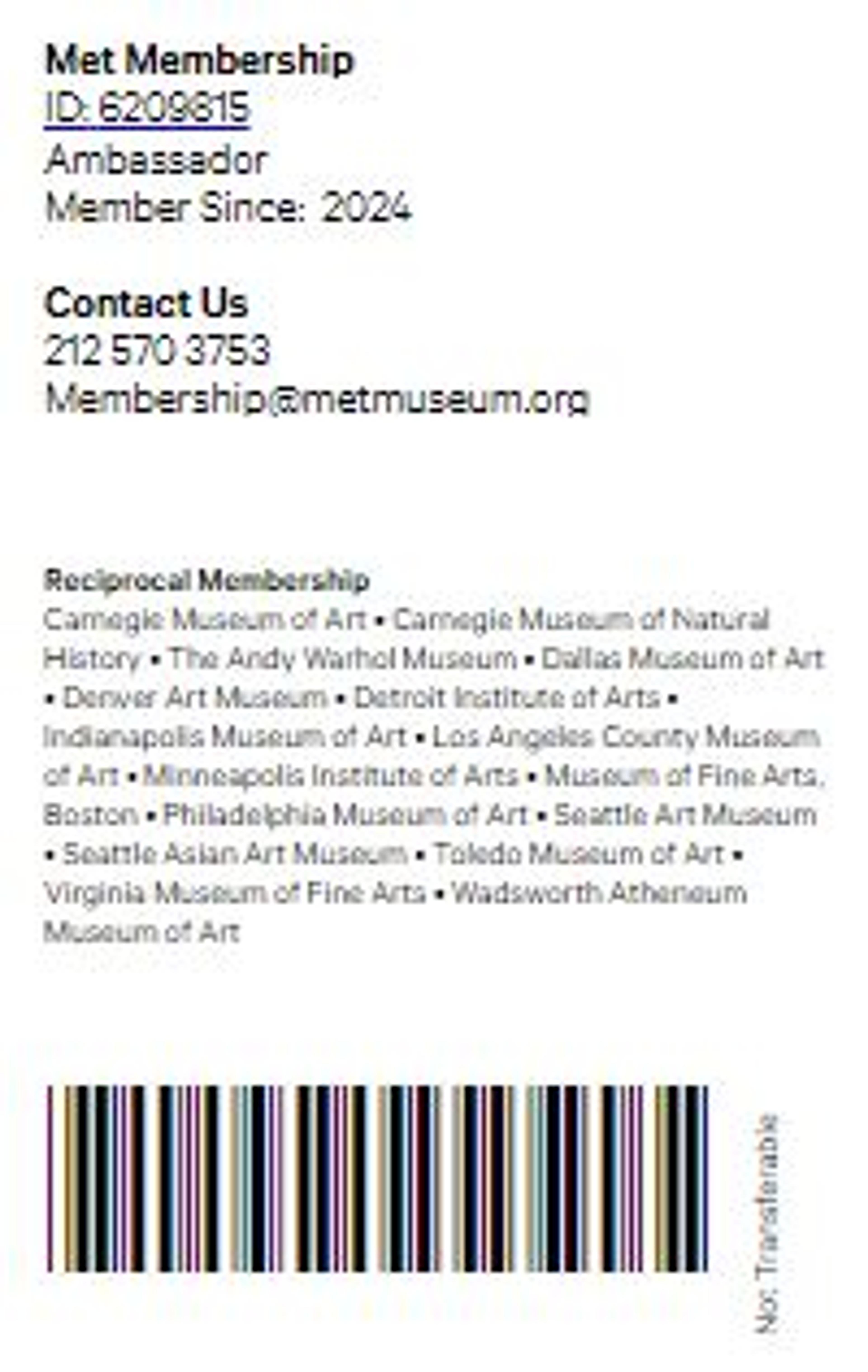 All Memberships at The Met are issued to individual persons and are non-transferable. We do not offer Library or Gallery Memberships, as each Membership card must be issued to a person and not an institution.