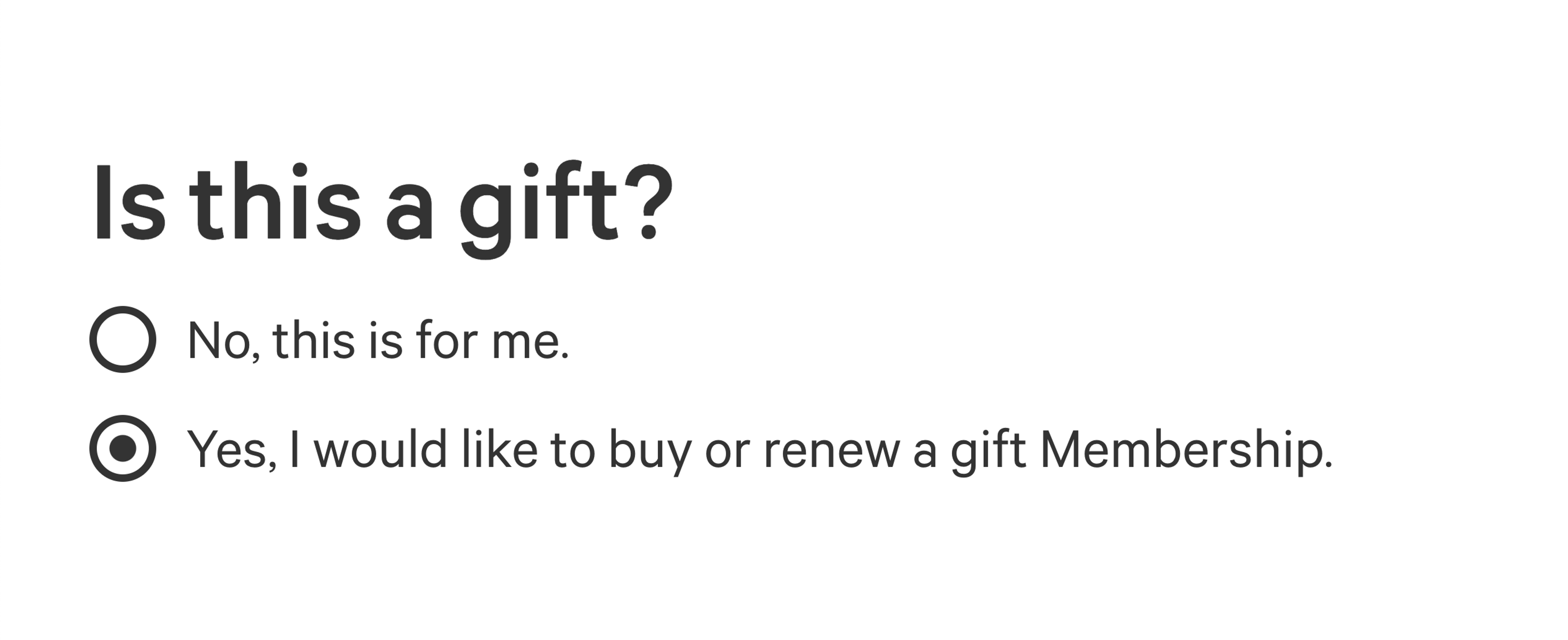 To indicate that a Membership is a gift, please select “Yes, I would like to gift a new Membership or renew an existing Membership” as below.