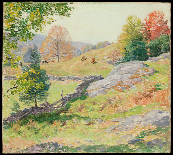 Painted only three years before Metcalf's death, this autumnal landscape depicts the hilly farmland around Springfield, Vermont. A late example of Metcalf's work in the Impressionist mode, it is brightly colored, with dry, broken brushstrokes which often expose the bare canvas. The artist was influenced by Impressionism as a result of his friendships with artists such as Childe Hassam and his membership in the Ten American Painters, a group consisting largely of Impressionist artists.