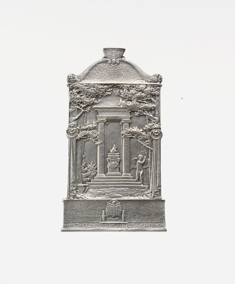 Saint-Gaudens’s pleasure at this fête champêtre, as he called it, resulted in his modeling an affectionate tribute to the masque participants in the form of silvered plaquettes struck in Paris and distributed during the summer of 1906 (the playwright Shipman received a large gilded bronze version; 2017.155). The classicizing design, topped by the golden bowl presented to Saint-Gaudens at the end of the play, recreates the Arcadian setting of the masque—curtained trees flanking a columned temple with a lighted altar. Winged Amor appears on the temple steps with a lyre. On the pediment above and the plinth below, Saint-Gaudens painstakingly included the name of all the participants in the masque, and the back of each plaquette was inscribed with the individual recipient’s name.