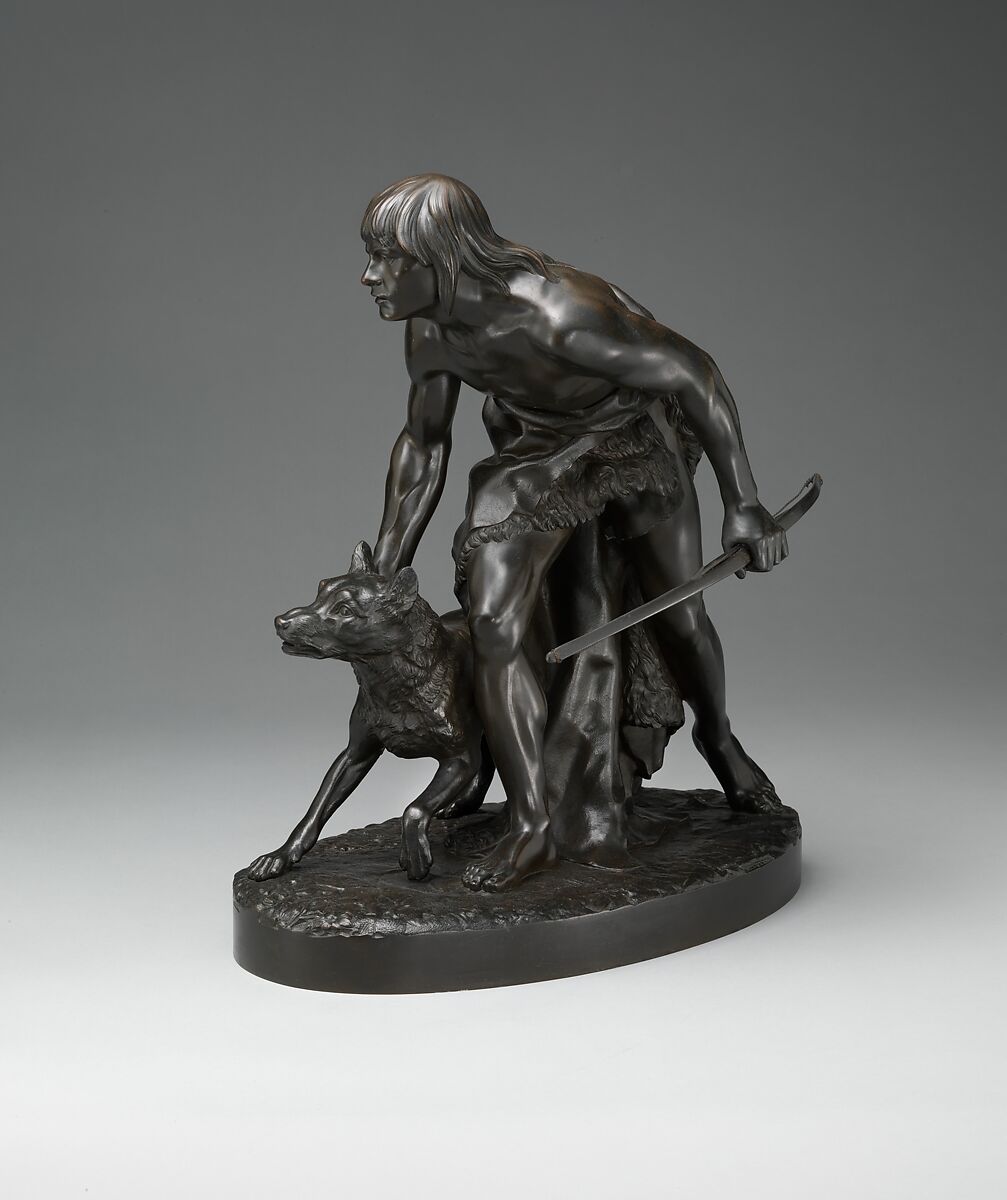 With his statuette of a Native American youth and his dog, Ward answered the call for sculpture modeled by home-based, rather than expatriate, artists in a realist style. He imagined an Arcadian hunting scene, a stark contrast to the reservation system by then established to confine Indigenous peoples to U.S. government-specified tracts of land. He later enlarged his model, making refinements based on drawings and wax studies from an 1864 trip to Dakota Territory. An overlifesize bronze was dedicated in New York’s Central Park in 1869, becoming the first sculpture by an American artist to be erected there.