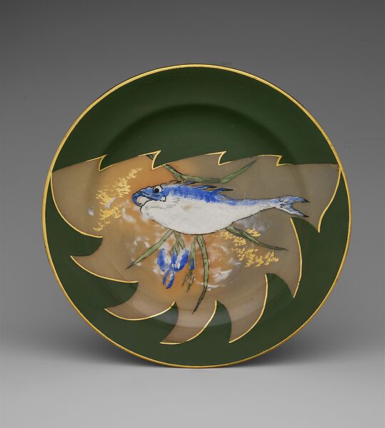 The fish and iris design on this plate indicate the prevailing interest in Japanese prints during the early 1880s. Though unsigned, the plate's similarity in subject matter and painting style relate closely to signed work by Maria Longworth Nichols. This piece may have come from the first kiln of the Rookwood Pottery. For other examples of Rookwood Pottery see: 43.67, 45.147, 69.17, 69.37.1–.3, 1973.93, 1974.214.28, 1980.452, 1980.453, 1981.443, L.1984.132, and 1991.335.