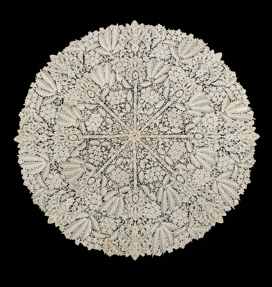 The lace seen here is created specifically for the parasol cover format with eight spokes coming out from the center, corresponding to the ribs of the parasol. Each of the eight sections has an identical symmetrical design. This would have been a highly prized possession and on the parasol it was loosely tacked in one place at each rib. The loose attachment clearly made it removable from the parasol, possibly to interchange with different covers.