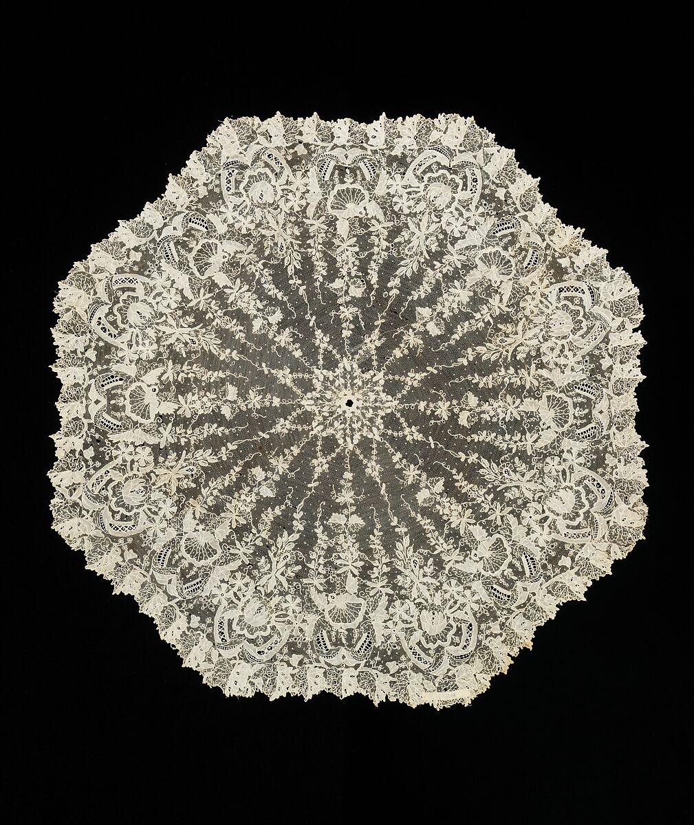 This is an excellent example of a very expensive and fine parasol cover. The pattern created for this specific format of eight sections, corresponds with the sections of the parasol. Inexpensive parasols were usually used just for a season and then discarded, but a parasol for which this would be a cover would be only of the finest quality and used for several years.