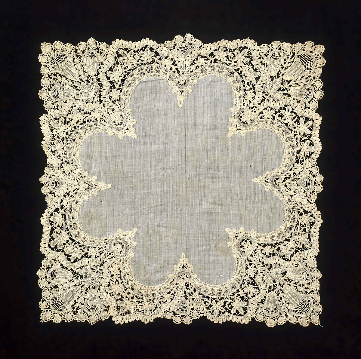 This example of duchesse lace shows how it can be fashioned to conform to the shape of the object for which it is made, in this case a handkerchief with four corners.