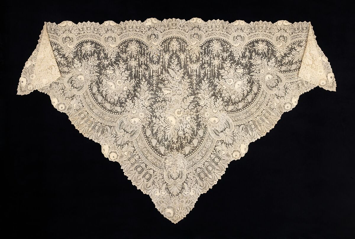 Point de gaze lace produced in Belgium was highly valued in the second half of the 19th century. A signature characteristic is the two-dimensional rose motif which adds surface interest. Often lace pieces of this size combine handmade motifs with machine-made net grounds, but this is completely handmade. It would have been extremely expensive to produce, considering the sheer size of the piece, the density of the motifs and the time required to work it all by hand. It is a premier example of mid-19th century lace-making.