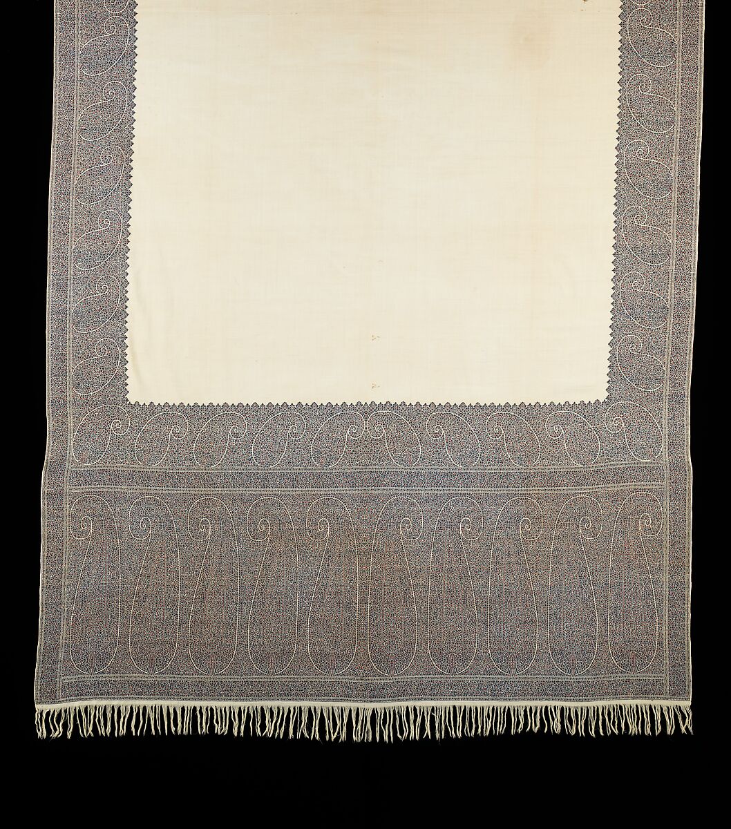 This very finely woven shawl is a good example of the refinement and skill of the French weavers in imitating the Indian and Persian shawls being imported at the time. In ways, the beauty of this woven shawl surpasses that of its inspiration and indicates how this style of outerwear was often considered an heirloom and handed down through generations.