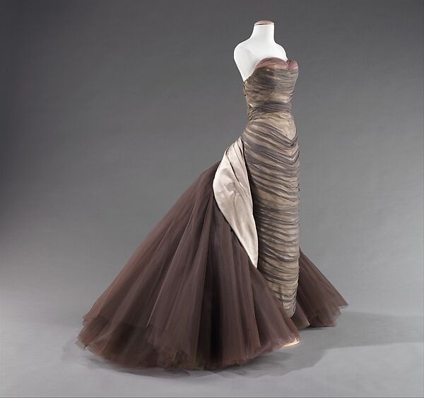 查尔斯·詹姆斯从1930年代开始他的设计生涯,在1940年代晚期至1950年代中期经历了一段特别有创造力的时期。詹姆斯被视为在真正的高级时装传统中创作的唯一一位美国人,他的品牌中的每一件服装都是自己亲自装饰和构思的。这件礼服以詹姆斯的方式诠释了1880年代早期带臀垫的紧身裙。紧贴身体的塑形上衣固定住这个设计,突出女性曲线;巨大的后裙摆呈扩张的丝网状,移动时有如波浪翻滚,风情万种。这件礼服重达18 磅,使用了25 码长的薄纱。