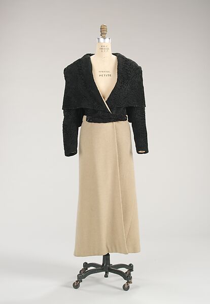 This coat masquerades as a skirt and blouse to offer a graceful silhouette to an otherwise utilitarian garment. The contrast between the beautifully crafted shining black fur and matte camel-colored wool is expressive of 1930s evening wear.