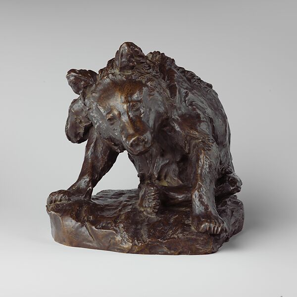 In 1889, the French-trained sculptor Paul Wayland Bartlett earned a Grand Prix for his life-size bronze Bohemian Bear Tamer at the Exposition Universelle in Paris. The multi-figure sculpture was purchased for the Metropolitan Museum of Art in 1891 by "a group of gentlemen." Bartlett capitalized on the success of Bohemian Bear Tamer (91.14) by casting bronze reductions after the gypsy figure and standing bear, as well as after the seated bear cub scratching behind his right ear. He was one of the first American sculptors savvy to the potential of generating income by issuing editions of small bronzes after large groups and public monuments. The Met’s Bear Cub Grooming was sand cast in a French foundry, and then skillfully chased and patinated to enhance the artist’s lively surface modeling and the rich texture of fur tufts. Bartlett’s sophisticated knowledge of animal anatomy, expertly revealed in this charming statuette, was learned through study with the leading French animal sculptor Emmanuel Frémiet. The statuette is stamped TIFFANY & CO., suggesting that it was sold through Tiffany’s retail showrooms in New York, a leading distributor of small bronze sculptures in the early years of the twentieth century.