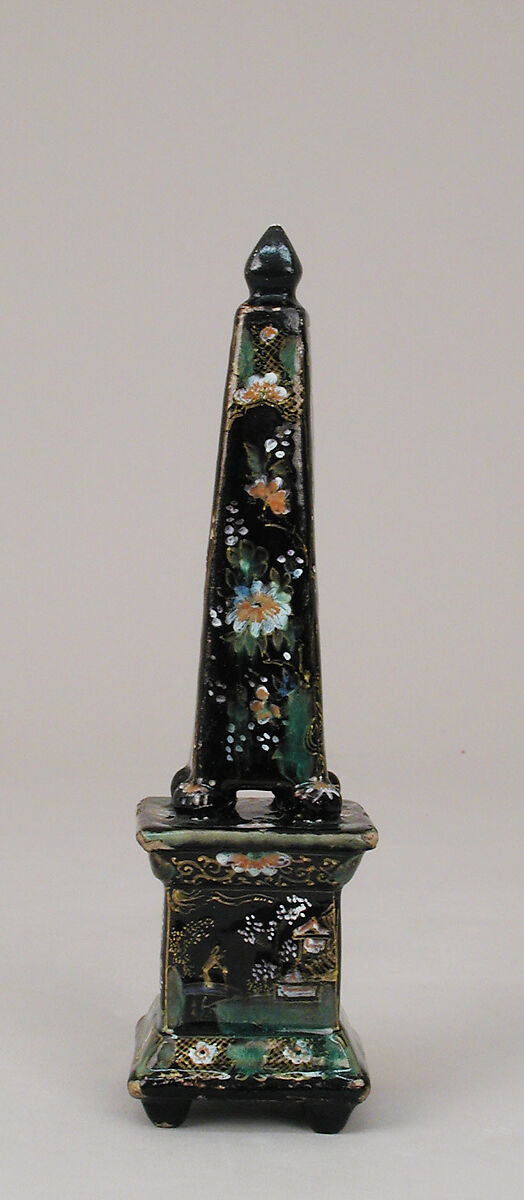 Although inspired by imported porcelain and lacquerware in its decoration, the obelisk derives its form from ancient Egyptian civilization when the obelisk was used as a monument to immortalize gods, events, and rulers. In Europe over time, the obelisk became a display piece often made in hard stones, silver, porcelain or other materials to decorate a mantelpiece or dining table.