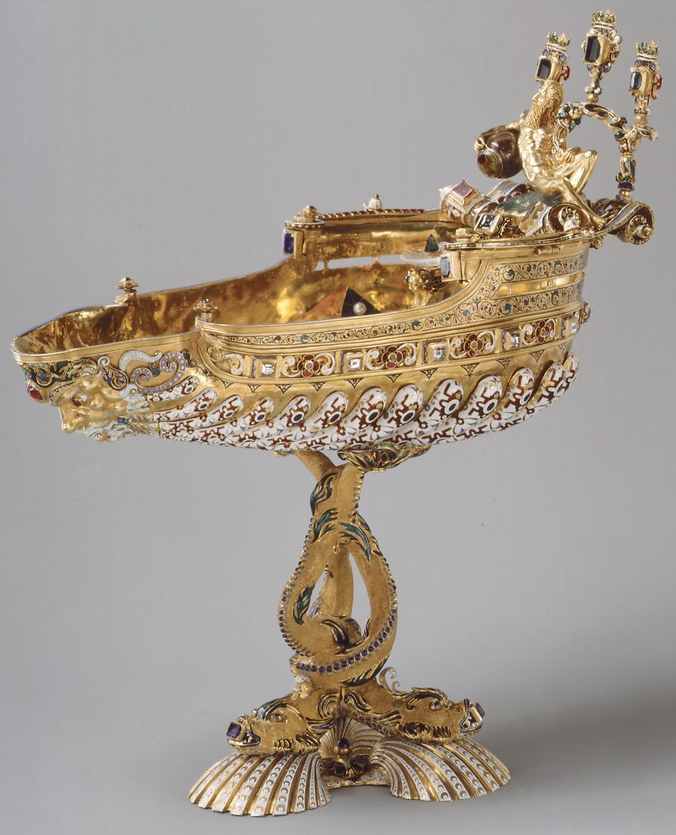 - Medium: Gold, partly enameled and set with diamonds, emeralds, rubies, pearls, sardonyx, and glass